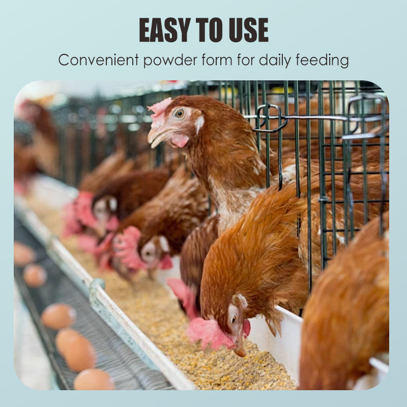 VERSATILE AND EASY TO USE - Ideal for various poultry farming environments, this supplement is easy to incorporate into daily feeding routines. Its powder form ensures effortless use in both small and large-scale operations, delivering consistent results.