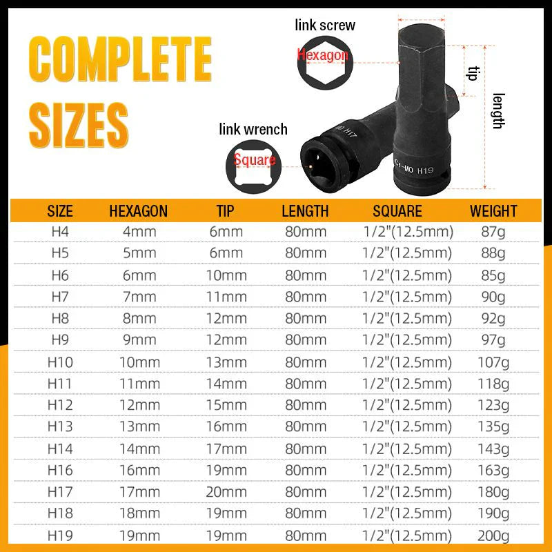 Package Includes: 1x 1/2” Pneumatic Wrench Hexagonal Drive Bits